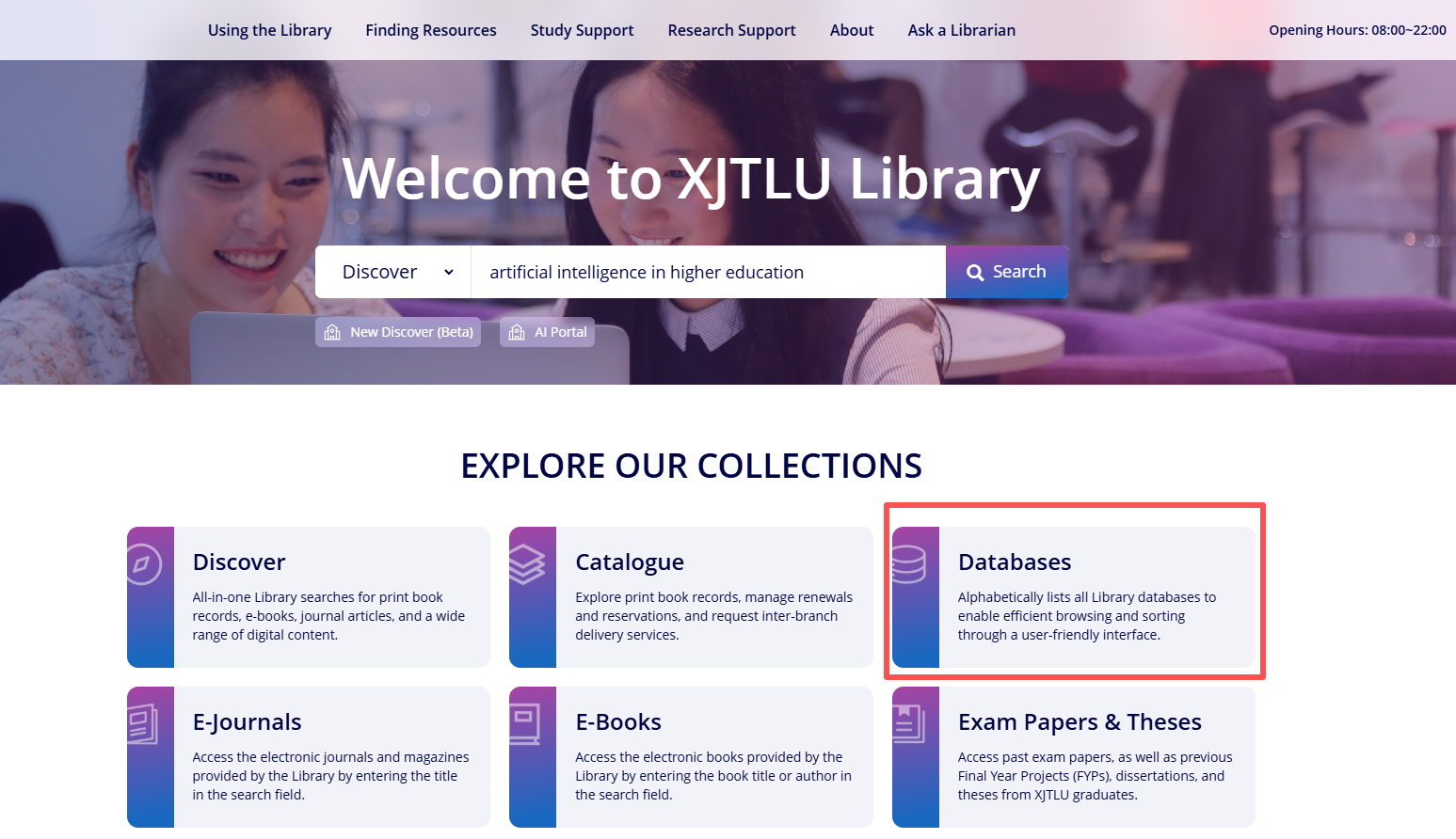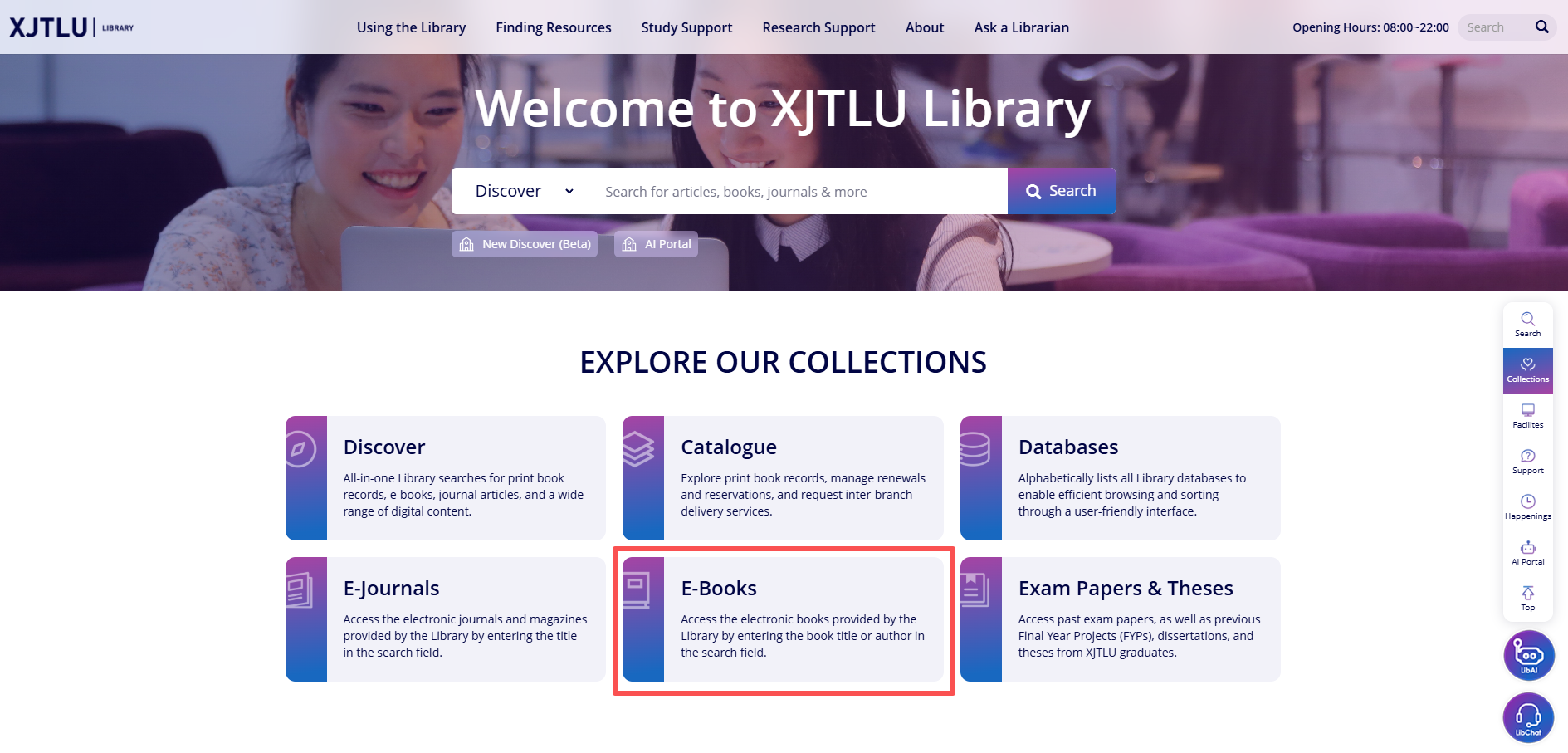 Discover can not only help you find the e-books purchased or subscribed by XJTLU Library, but also find Open Access e-books which are freely available online.