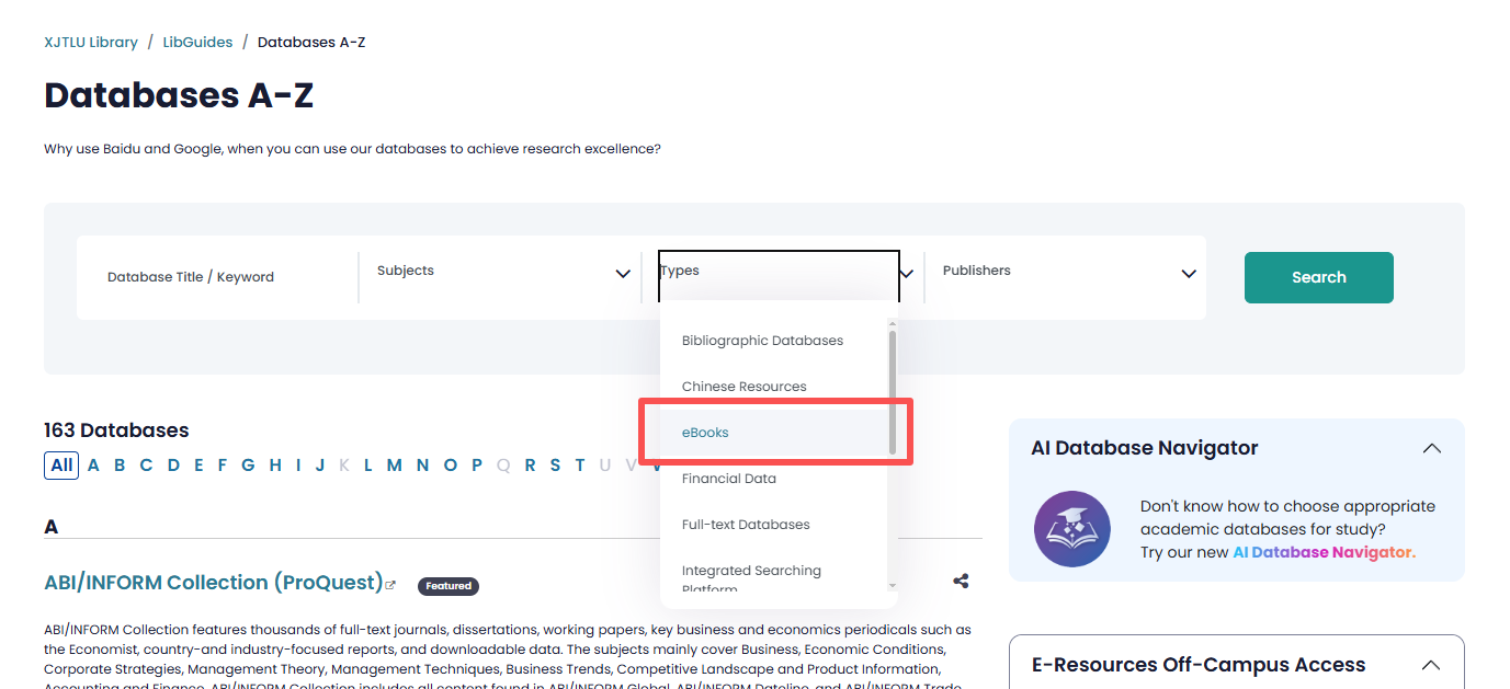 In the Databases A-Z list, select "eBooks" under "All Database Types" to find the e-book collections. You can also use the "All Subjects" filter to further limit the subject.