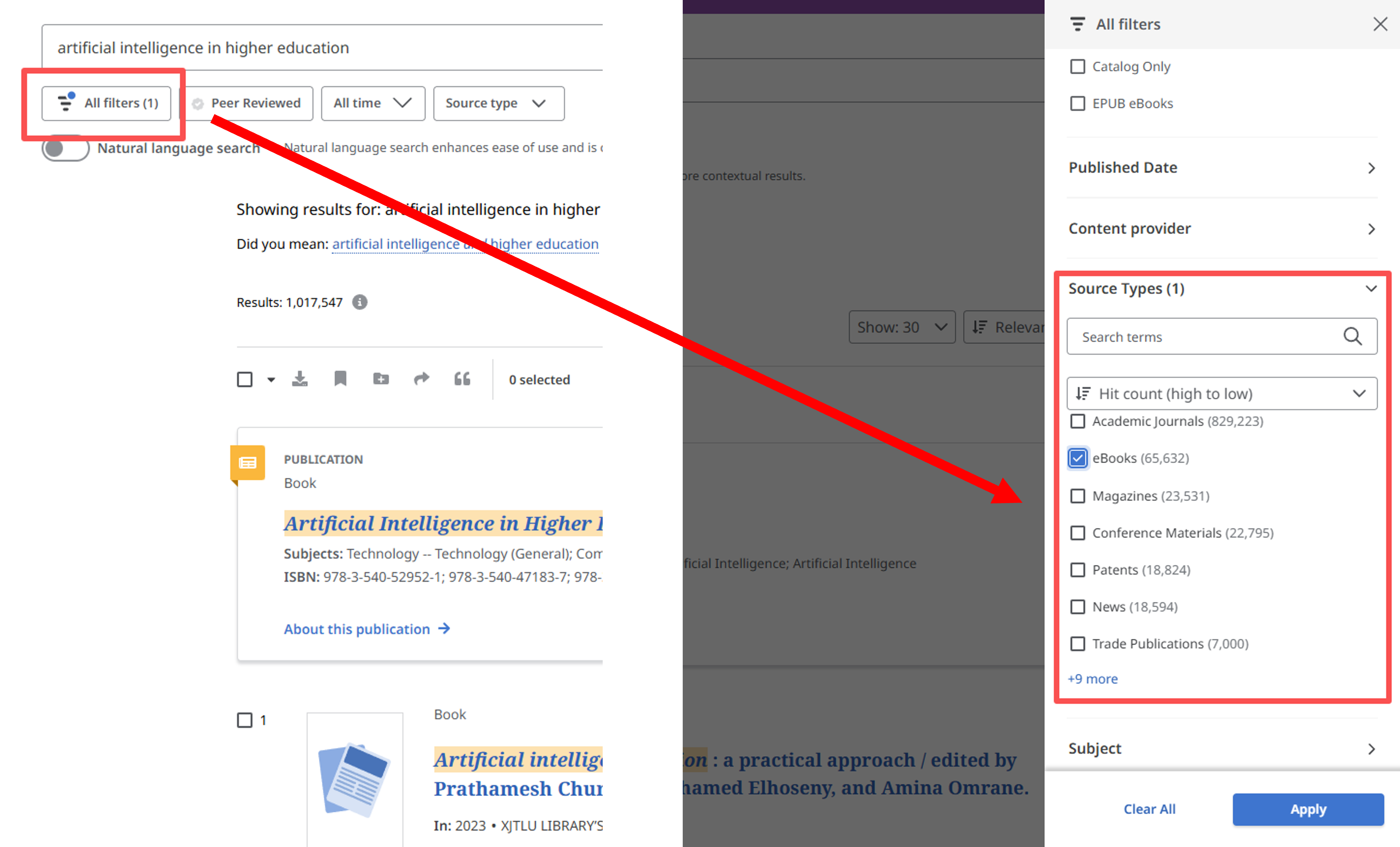Make sure that you have limited the Source Types to eBooks and Electronic Resources to get the most accurate results. We do not recommend you to select Books in the Source Types filter, or you will also get a list of records of print books.