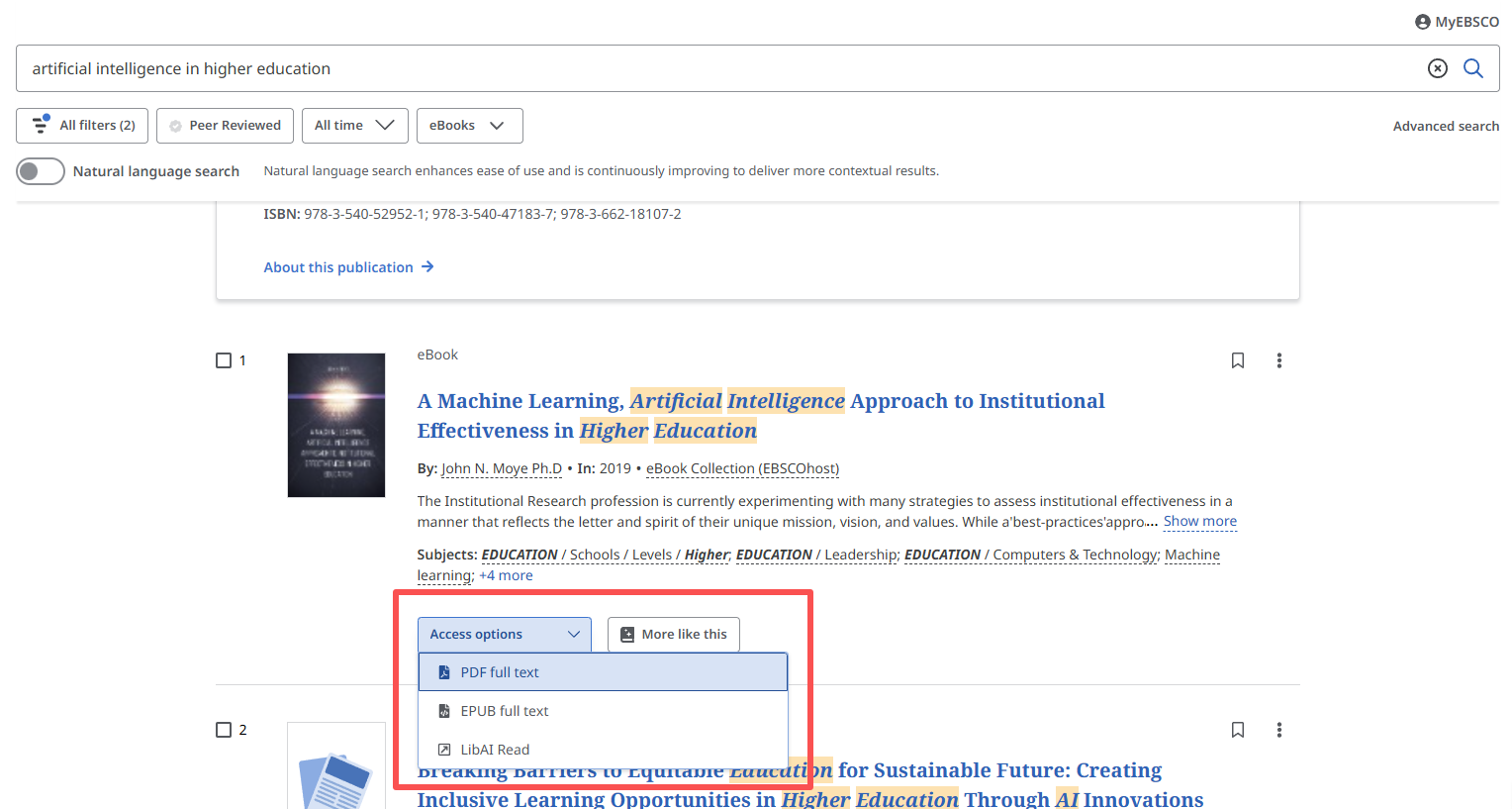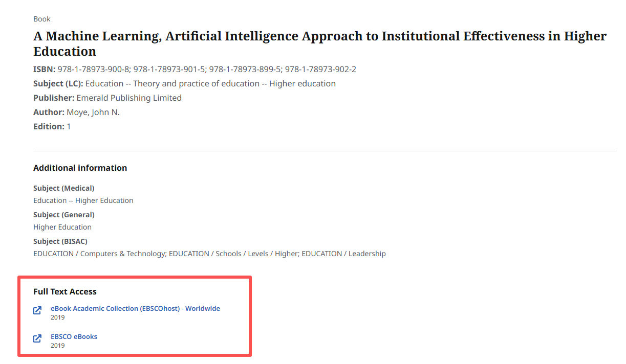 In search results list, you will be able to find the matched records. There might be two or three records indicating the same e-book, they are from different sources in the Discover systems and might be categorised as different types of resources in Discover. But the links under each record can all help you to find the full text.